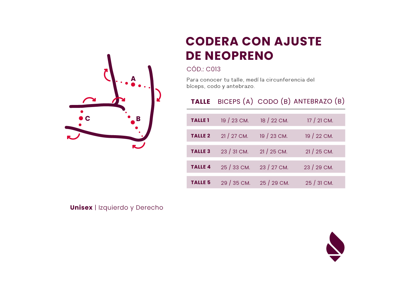 | Talle | Talle 1: circunferencia de bíceps desde 22 cm hasta 26 cm, Talle 2: circunferencia de bíceps desde 24 cm hasta 30 cm, Talle 3: circunferencia de bíceps desde 26 cm hasta 34 cm, Talle 4: circunferencia de bíceps desde 28 cm hasta 36 cm, Talle 5: circunferencia de bíceps desde 32 cm hasta 38 cm |
