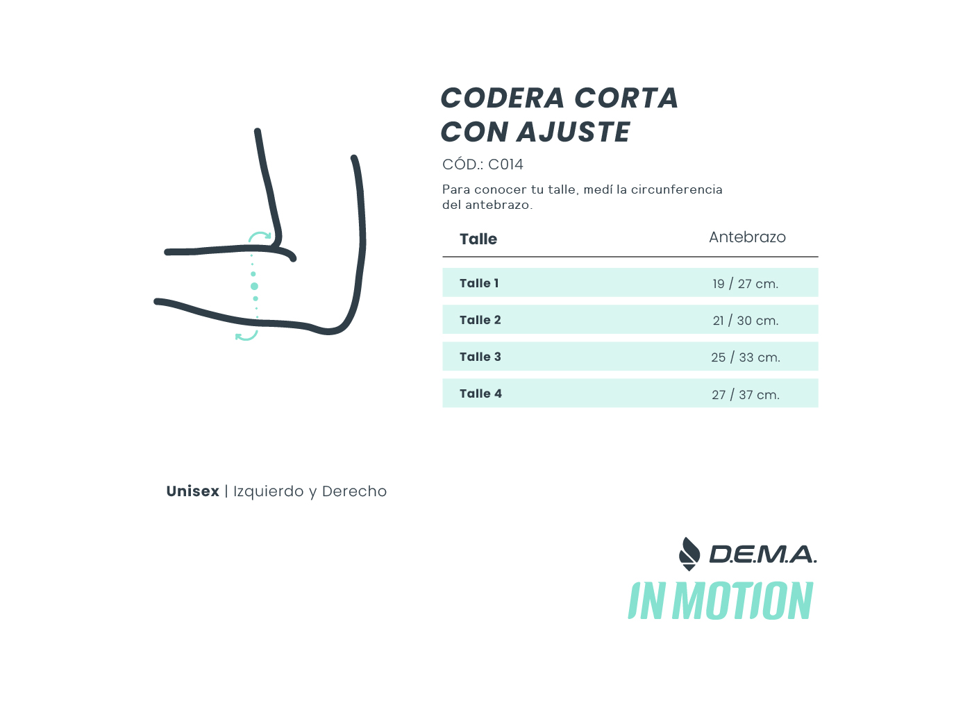 | Talle | Talle 1: circunferencia de antebrazo desde 19 cm hasta 27 cm., Talle 2: circunferencia de antebrazo desde 21 cm hasta 30 cm., Talle 3: circunferencia de antebrazo desde 25 cm hasta 33 cm., Talle 4: circunferencia de antebrazo desde 27 cm hasta 37 cm. |