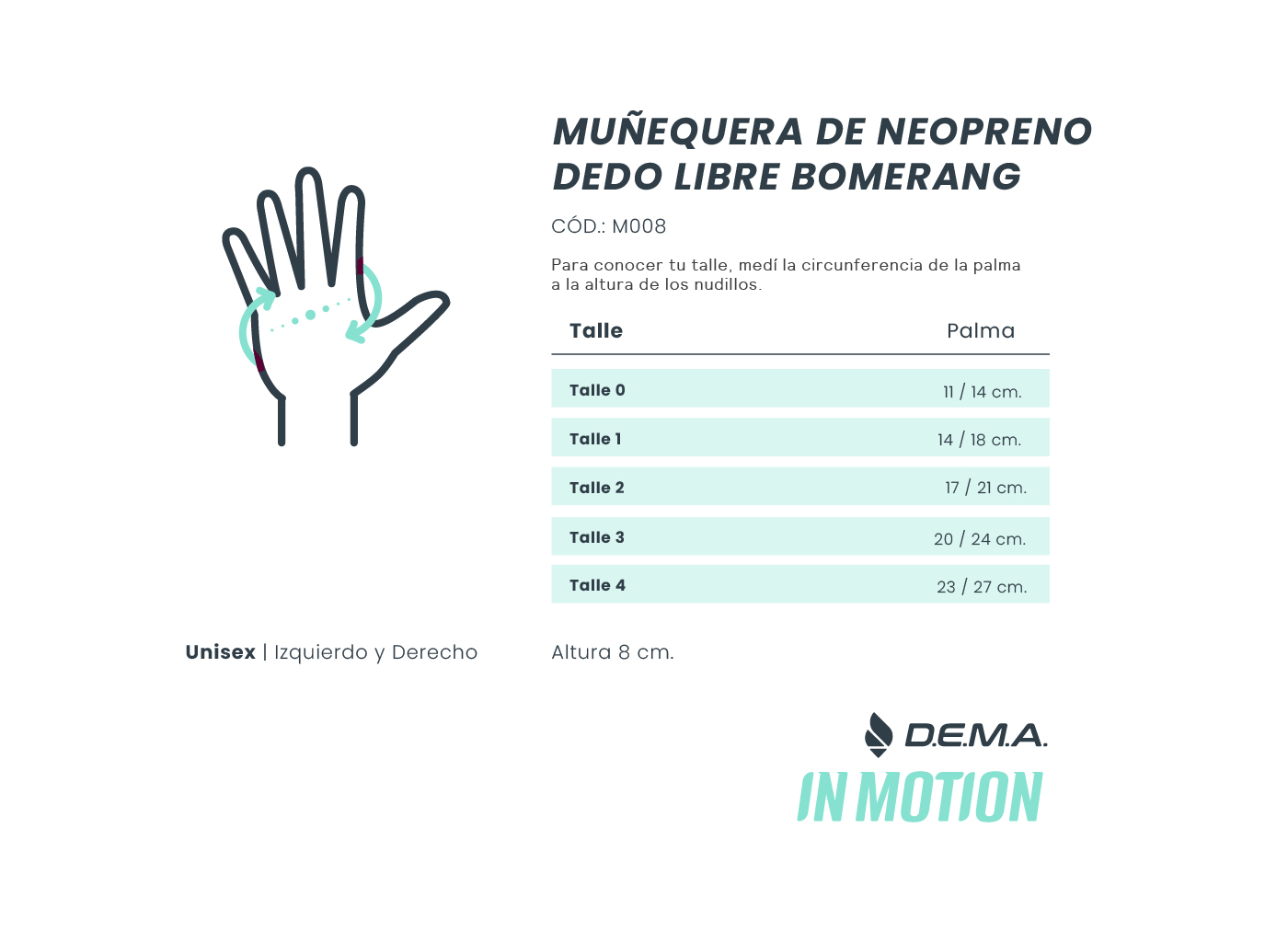 Descripción La muñequera es un tipo de soporte gradual que cumple la función de asistencia a nuestras articulaciones, ligamentos y grupos musculares, para ayudarte a superar una lesión y malestar o prevenir tensiones en momentos de mayor esfuerzo. El material en neoprene brinda calor terapéutico, lo que ayuda a aumentar el riego sanguíneo para asistir a la dinámica del cuerpo. Estabiliza y contiene la movilidad articular de la muñeca con posibilidad de regulación de la compresión deseada. Patologías que requieran limitar los movimientos de muñeca en forma progresiva, teniendo la posibilidad de realizar ajustes según la necesidad, como pacientes con edema de la articulación, artritis, esguinces, distensiones y torceduras. Alivio en patologías como artrosis, artritis y síndrome del túnel carpiano. Prevención de lesiones en las prácticas deportivas. Adaptable a ambas manos. Confección Confeccionada en neoprene 4 milímetros de espesor. Cierre regulable en abrojo. Medidas Medir la circunferencia palmar. Talle 0: circunferencia palmar desde 11 cm hasta 14 cm. Talle 1: circunferencia palmar desde 14 cm hasta 18 cm. Talle 2: circunferencia palmar desde 17 cm hasta 21 cm. Talle 3: circunferencia palmar desde 20 cm hasta 24 cm. Talle 4: circunferencia palmar desde 23 cm hasta 27 cm. Altura 8 cm. Como se utiliza 1-Ubicar el pulgar dentro del orificio de la prenda 2- Sujetar el extremo más largo y envolver alrededor de la muñeca 3-Cerrar con el abrojo.