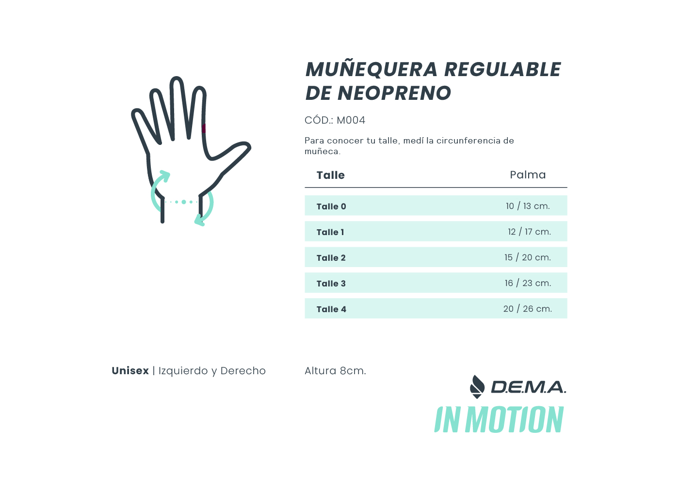 | Talle | Talle 0 (muñeca desde 13 cm hasta 16 cm), Talle 1 (muñeca desde 15 cm hasta 20 cm), Talle 2 (muñeca desde 18 cm hasta 23 cm), Talle 3 (muñeca desde 19 cm hasta 26 cm), Talle 4 (muñeca desde 22 cm hasta 29 cm) |