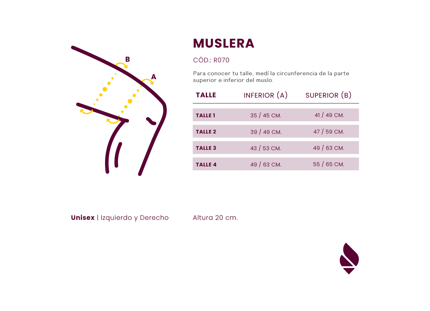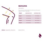 Descripción La muslera es un tipo de soporte gradual que cumple la función de asistencia a nuestras articulaciones, ligamentos y grupos musculares, para ayudarte a superar una lesión y malestar o prevenir tensiones en momentos de mayor esfuerzo. Estabiliza a la región del muslo: cuádriceps e isquiotibial. Patologías que requieran limitar y contener la movilidad del muslo, debido a propensión a desarrollar lesiones musculares a ese nivel (distensiones, desgarros, esguinces, calambres) Confección Confeccionada en elástico reforzado, nivel de contención III: poliéster 65% goma 35%. Ajustable en abrojo. Medidas Medir la circunferencia del muslo. Talle 1: circunferencia inferior desde 31 cm hasta 37 cm. superior desde 37 cm hasta 43 cm. Talle 2: circunferencia inferior desde 35 cm hasta 41 cm. superior desde 41 cm hasta 45 cm. Talle 3: circunferencia inferior desde 37 cm hasta 43 cm. superior desde 43 cm hasta 49 cm. Talle 4: circunferencia inferior desde 41 cm hasta 47 cm. superior desde 47 cm hasta 53 cm. Talle 5: circunferencia inferior desde 47 cm hasta 55 cm. superior desde 51 cm hasta 59 cm. Altura de 26 cm. Como se Utiliza 1-Introducir la prenda desde el pie hasta posicionarla en el cuádriceps. 2- Ajustar el abrojo.
