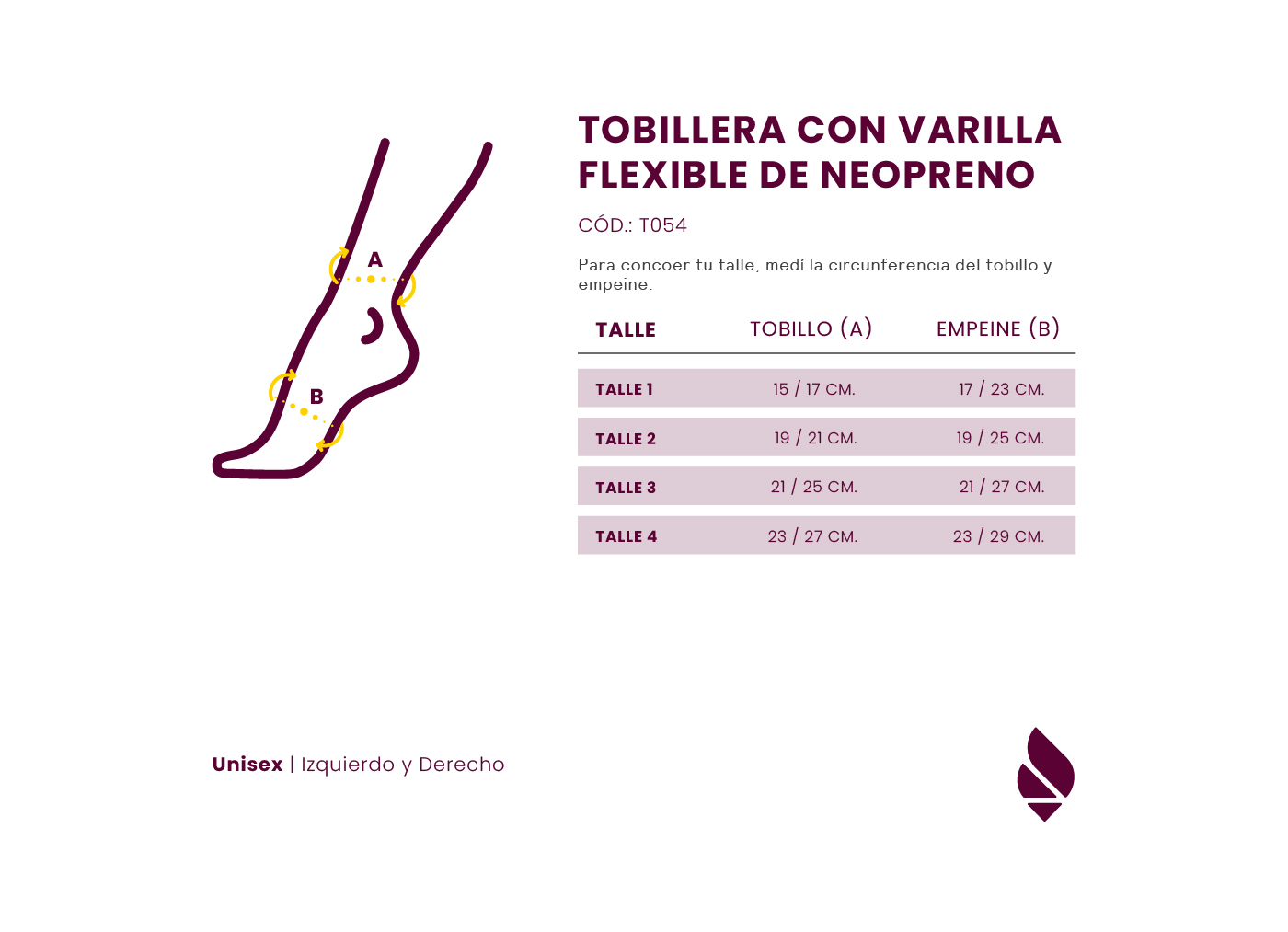 | Talle | Talle 1 (circunferencia de tobillo desde 15 cm hasta 17 cm), Talle 2 (circunferencia de tobillo desde 19 cm hasta 21 cm), Talle 3 (circunferencia de tobillo desde 21 cm hasta 25 cm), Talle 4 (circunferencia de tobillo desde 23 cm hasta 27 cm) |